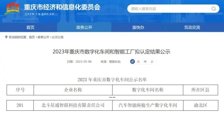 近日,重庆市经济和信息化委员会发布了《2023年重庆市数字化车间和智能工厂拟认定结果公示》,北斗星通智联科技有限责任公司(bicv)凭借先进的数字化制造能力获评为“2023年重庆市数字化车间”。